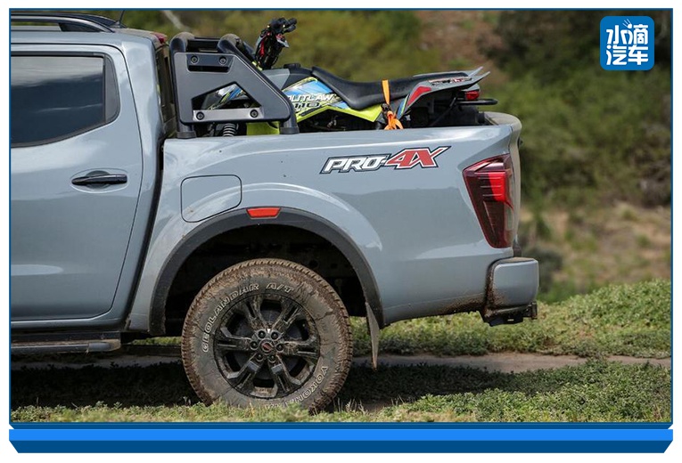 纳瓦拉的PRO-4X版本的侧面还对轮眉、轮毂、行李架等诸多细节都进行了黑化处理,货箱上方配备了防滚架,防止越野时发生翻滚的意外。前后轮眉处均使用红色装饰提高版本辨识度,车门下方配备了脚踏方便乘客上下车,另外车身货箱处还贴上了标识性的贴纸。