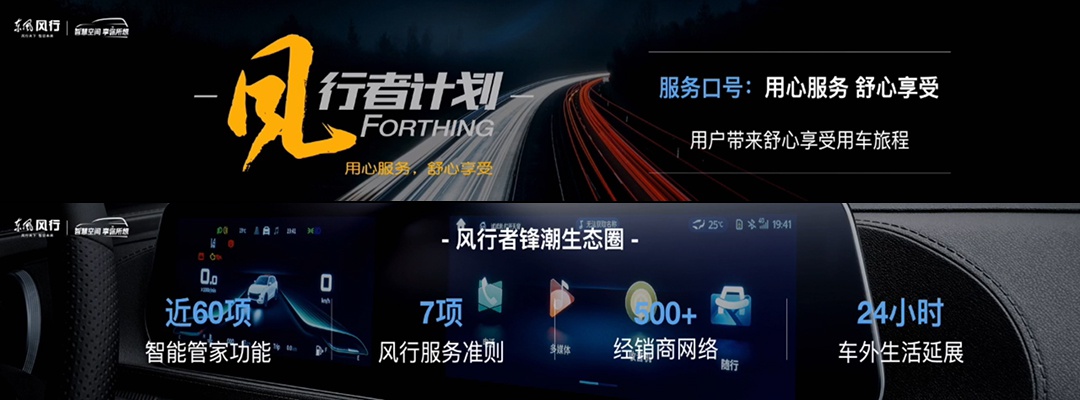 风行者锋潮生态圈拥有近60项智能管家功能,7项风行服务准则,超500家经销商网络,24小时的车外生活延展。