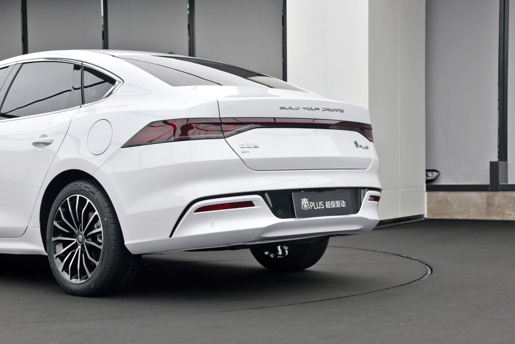 秦PLUS的侧面造型其实与秦Pro相似,溜背的造型有一丝轿跑车的感觉。目前,秦PLUS的车身尺寸并没有公布,不过鉴于秦PLUS定位在秦Pro和“汉”之间,所以它的车身尺寸肯定不会小,保守估计轴距要在2760mm—2800mm之间。新车尾部设计的最大亮点则是贯穿式LED尾灯和简化后的“Build Your Dream”字体,而隐藏式的排气布局彰显了它新能源车的身份。