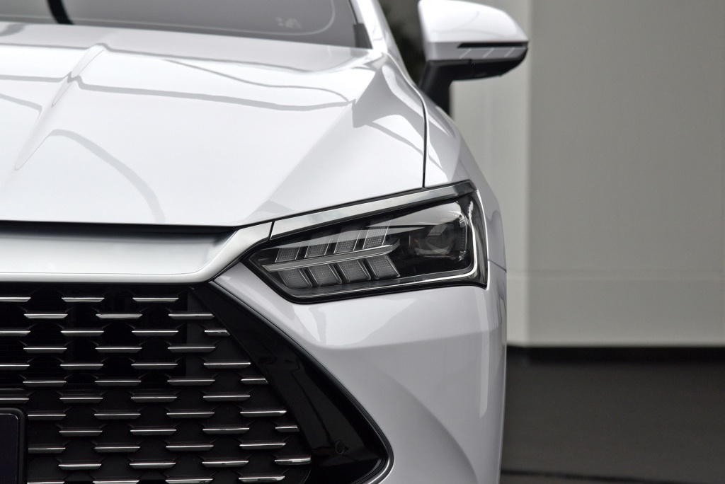 如果不走近看秦PLUS,你真的很难将秦PLUS和汉DM (配置|询价)区分开,因为它们前脸上的“大嘴”进气格栅实在是太像了。内部都采用了“铠甲点阵”式的设计,时尚之余更有战斗、激进。当然,秦PLUS的前脸设计也有不同于其它比亚迪车型的地方,那就是“箭羽”式的大灯,虽然视觉效果不那么高级,但是造型足够新颖,算是又一次将中国的传统文化融入了其中。
