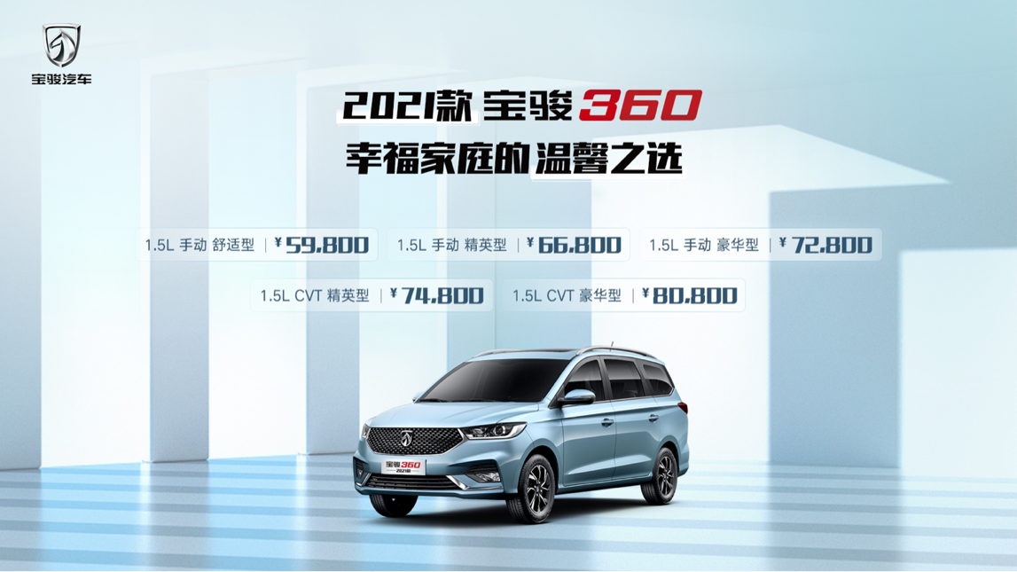 2020年11月19日上汽通用五菱公布2021款宝骏360正式上市,新车在外观与配置上进行了优化,为每个家庭带来进阶的温馨体验。此次推出手动舒适型、手动精英型、手动豪华型、CVT精英型、CVT豪华型共5款车型,官方售价5.98万-8.08万元。其中根据用户反馈新增手动舒适型,给用户提供性价比更高的优质产品。