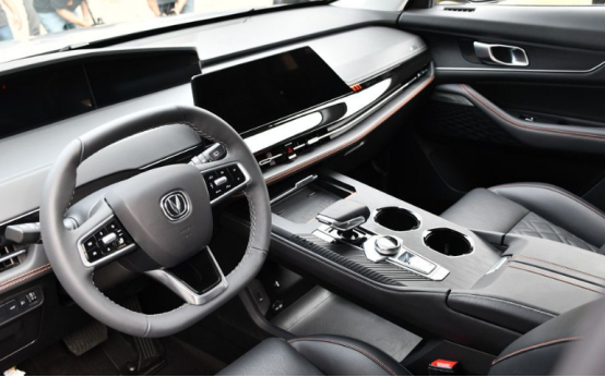 因为相比UNI-T大了一个级别,所以UNI-K看上去更加有那种高级感,气势上会更强。车头底部两侧的三叉戟式日间行车灯是个亮点,多功能方向盘采用了椭圆形设计,尺寸也是偏小的一类;而仪表盘由三款屏幕组成,配合悬浮式中控屏以及游艇式电子挡杆,对于科技氛围的营造十分到位。