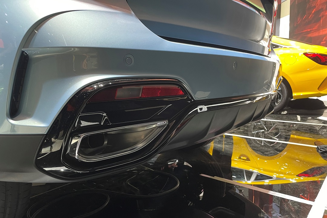 车尾部分,整体造型圆润富有层次感,尾灯同样采用三角形设计,与头灯的设计风格相似。车尾下方,熏黑饰条与银色双边双出布局的排气看起来非常和谐,宽大的扩散器也极具动感。