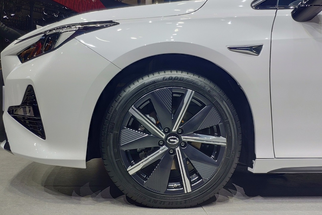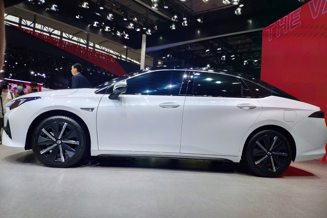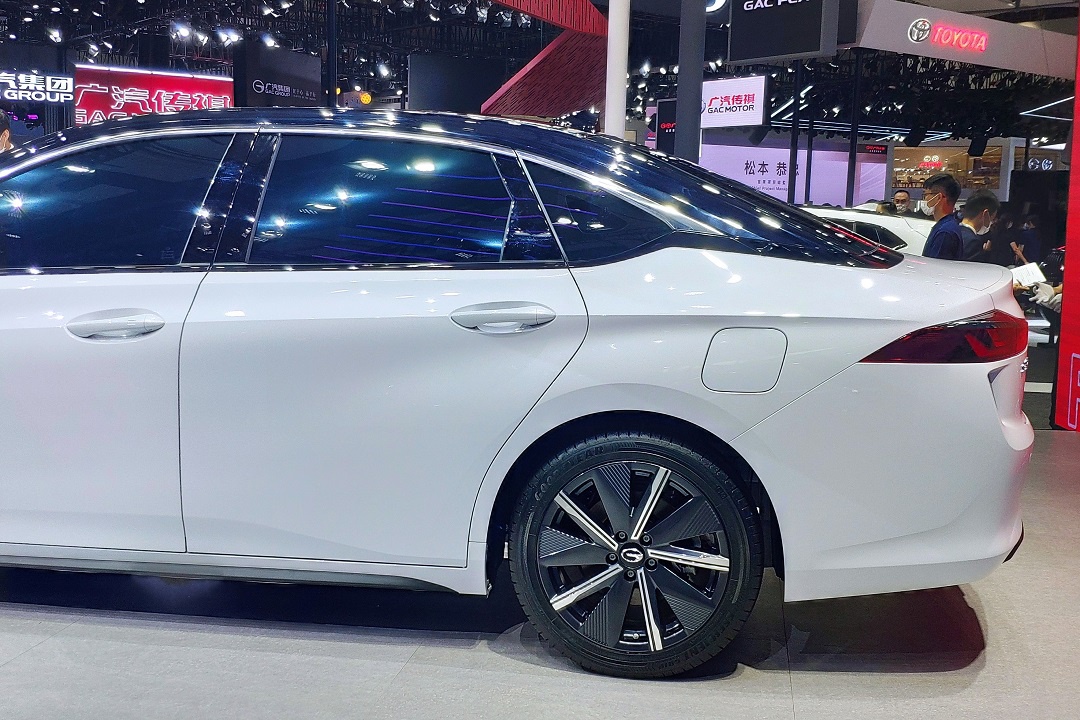 车身侧面,新车采用与埃安S大体相同,其中双腰线勾勒出了侧面造型,上部腰线笔直,从前部贯穿至后部,下部腰线曲折,立体感更强,整体使新车更具层次感。新车还配备了大尺寸多辐条轮圈,内部采用黑银双配色设计,突出了新车外观的运动感。此外,新车还将外后视镜布置在车门上,有效降低了驾驶员的视觉盲区。车身尺寸方面,新车的长宽高分别为4800/1880/1530mm,轴距为2750mm。