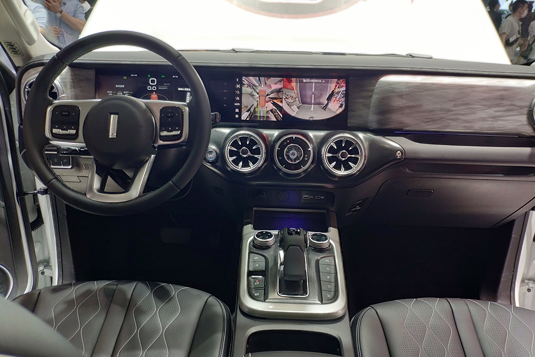 内饰方面,新车采用黑色作为主色调,整体设计语言较为简洁硬朗。车内线条以平直为主,搭配副驾驶前方的扶手,有着不错的越野氛围。在配置上,新车配有三辐式多功能方向盘、以及一体式联屏设计的仪表盘和中控大屏,为新车带来了十足的科技感和现代感。