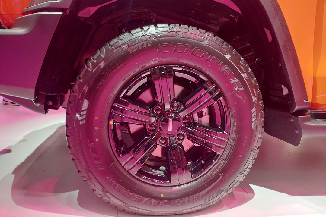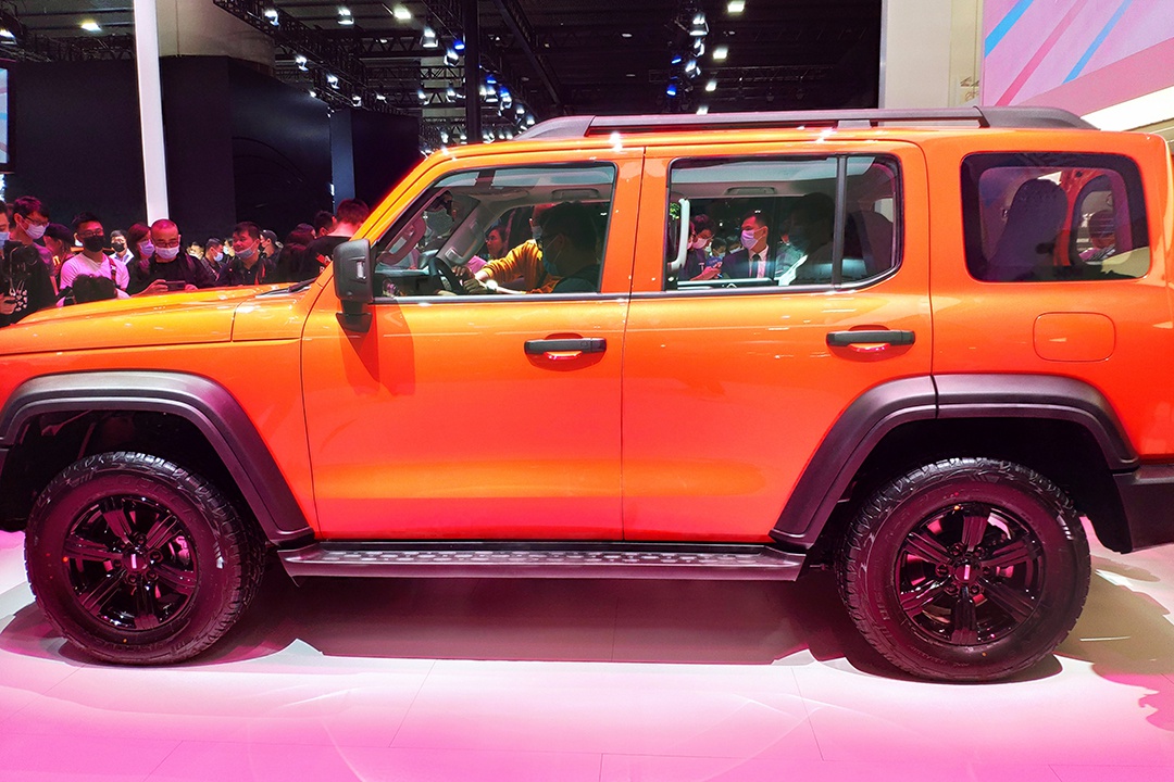 车身侧面,新车的造型较为方正,带来了扎实、硬朗的视觉感受。黑色的轮眉向外凸出,并且与车轮间留有着较高的间隙,增加了悬架的行程,也为后期改装带来了便利。车顶行李架以及脚踏板的装备,为坦克300带来了更高的实用性。下方轮圈尺寸较大,内部为熏黑多辐式造型,搭配AT胎的组合,可以胜任绝大多数的越野路面。