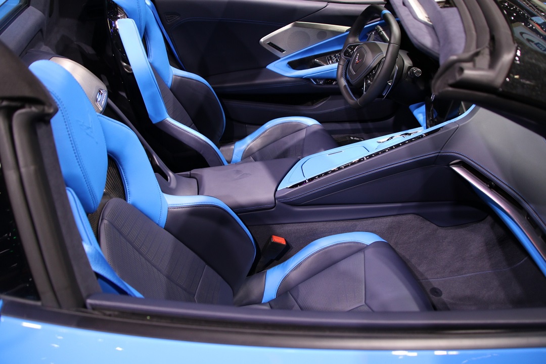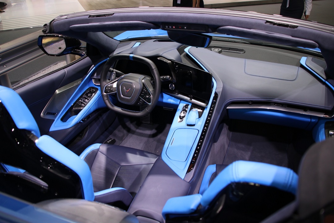 内饰方面,新车车厢采用了环抱式设计,并且新款克尔维特C8还配备了更偏向运动的双辐式多功能方向盘,同时,车内中控屏更偏向于驾驶员的方向,营造出一种赛车座舱的感觉。此外,新车内饰采用了蓝色和灰色拼色搭配,更加提升了车内的质感。
