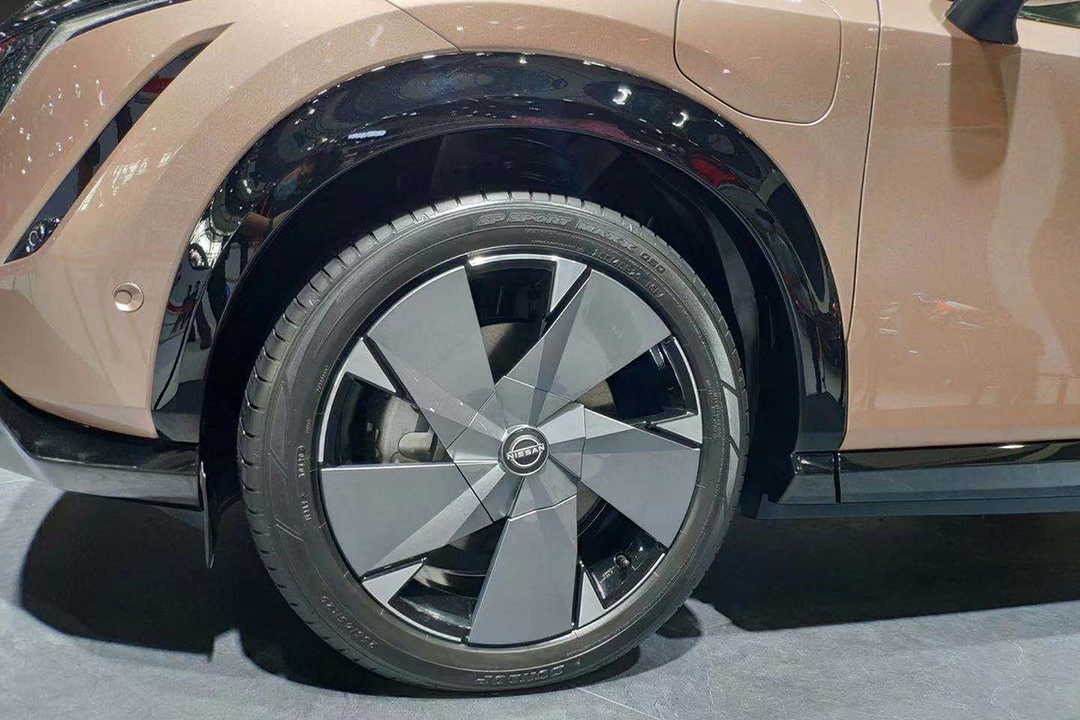 车身侧面,新车采用了双色车身的设计,搭配悬浮式车顶使视觉效果看起来更加时尚,同时,新车五辐式轮圈的造型配合黑色的宽轮眉,使日产Ariya看起来颇有一丝运动气息。