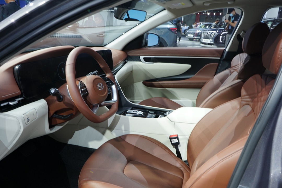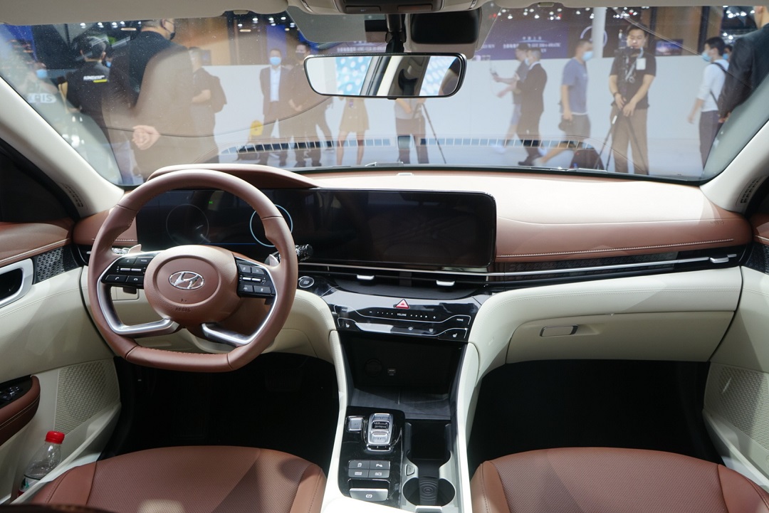 内饰部分,首先映入眼帘的就是白褐双色的内饰皮革,相比于全黑色的内饰,名图的内饰更具视觉冲击,并且使人更加放松舒适。全液晶仪表与中控屏上联屏的设计风格,加上极具设计感的空调控制面板,整车内饰让人感受到了充足的科技感,配合皮革以及设计风格将科技感与豪华感完美融合。