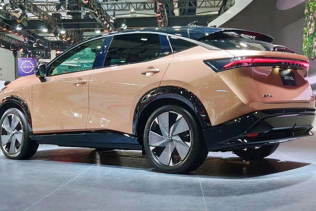车身侧面,新车采用了双色车身的设计,搭配悬浮式车顶使视觉效果看起来更加时尚,同时,新车五辐式轮圈的造型配合黑色的宽轮眉,使日产Ariya看起来颇有一丝运动气息。