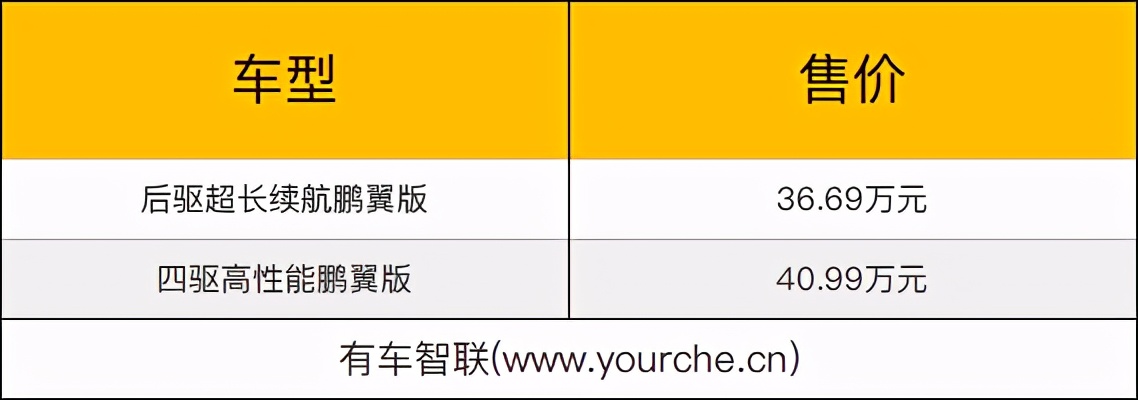 动力方面,其中后驱超长续航鹏翼版搭载后置单电机,单电机最大功率196千瓦,峰值扭矩390牛·米;动力电池方面,后驱超长续航鹏翼版搭载容量为80.9千瓦时的三元锂电池组,NEDC标准下续航里程为670公里。而四驱高性能鹏翼版搭载前后双电动机,单电机综合最大功率316千瓦,综合峰值扭矩655牛·米;动力电池方面,四驱高性能鹏翼版搭载容量为80.9千瓦时的三元锂电池组,在NEDC标准下续航里程为562公里。