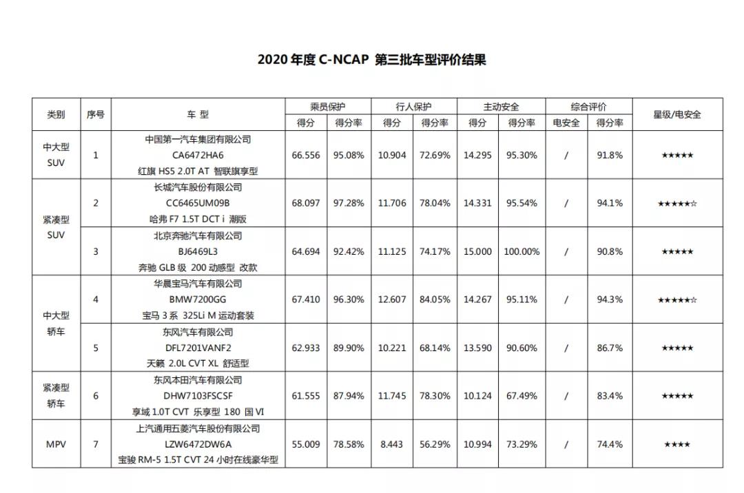近日,C-NCAP发布了本年度第三批车型的碰撞成绩,这批车型共有7台车,包含了紧凑级轿车、中型车、中型SUV、MPV等车型,其中总得分率最高的两台车型分别是宝马3系 (配置|询价) 325Li M 运动套装和哈弗F7 1.5T DCT i 潮版,得分率都超过了94%。