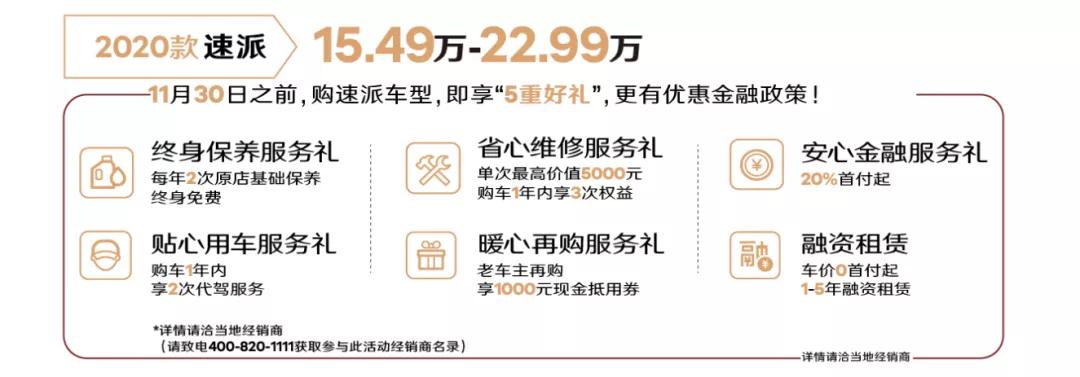 还是说车的变化吧,新款速派升级了智慧车联系统,增加了语音操作、在线导航、在线音乐、在线寻车、电子围栏等功能。并且在预售期间下定购买的话还可以享受每年2次基础保养、购车1年内2次代驾服务和3次省心维修服务等权益。