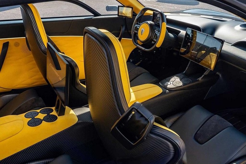 内饰方面,新车为两门四座车型,双辐式碳纤维运动方向盘搭配包裹性极强的赛车座椅大大提升了车内的驾驶感受与乘坐感受。同时,科尼赛克Gemera内饰采用了黄色和黑色的拼色设计,使车内质感看起来更具有冲击力。配置方面,新车配备六个智能安全气囊、L2级别驾驶辅助系统、自适应巡航控制、车道辅助、停车辅助、全景式摄像头等科技配置。