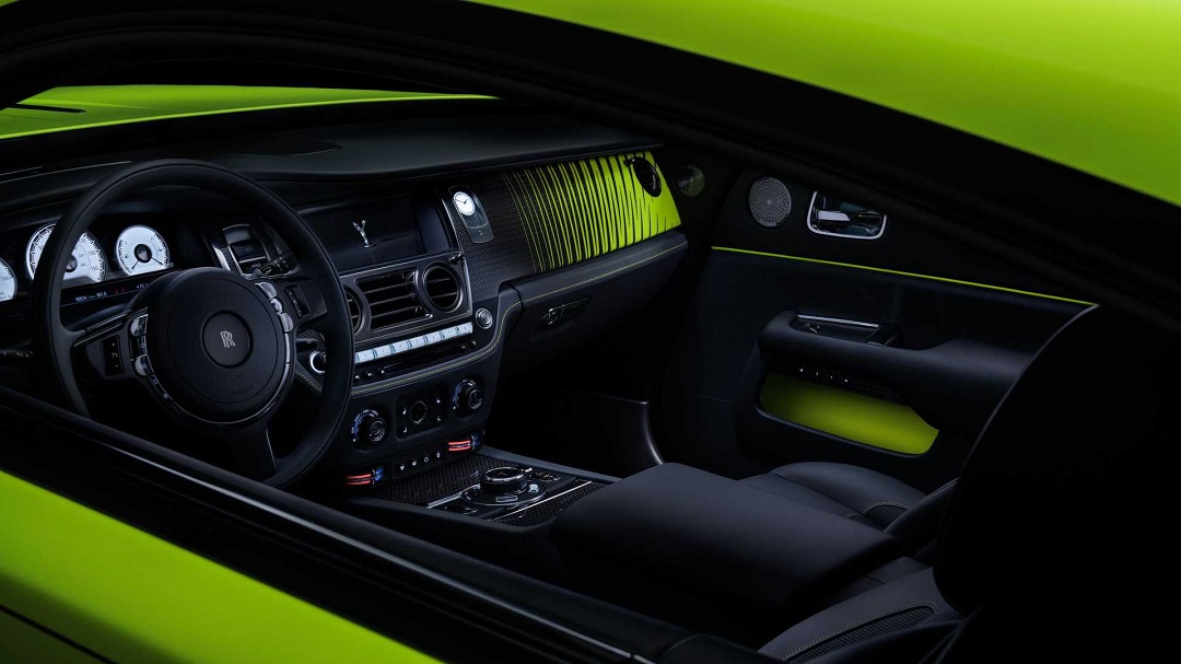 内饰部分,最大的改变就是与车身同色的缝线,以及副驾驶前方的饰板,车内的布局与普通版车型相似,依旧采用了复古典雅的造型,皮革与碳纤维材质的使用也提升了车内的质感,同样的,内饰的一切都可以按照客户的需求进行定制。劳斯莱斯在副驾驶前方的饰板上增添了名为“Technical Fibre”的饰条涂装,颜色和车身同色,饰板为碳纤维材质,一直贯穿于中控台,为黑白双色的内饰增添了不一样的色彩。与此同时,在车门处还有同色的饰条以及储物格饰板,与车身颜色交相呼应。