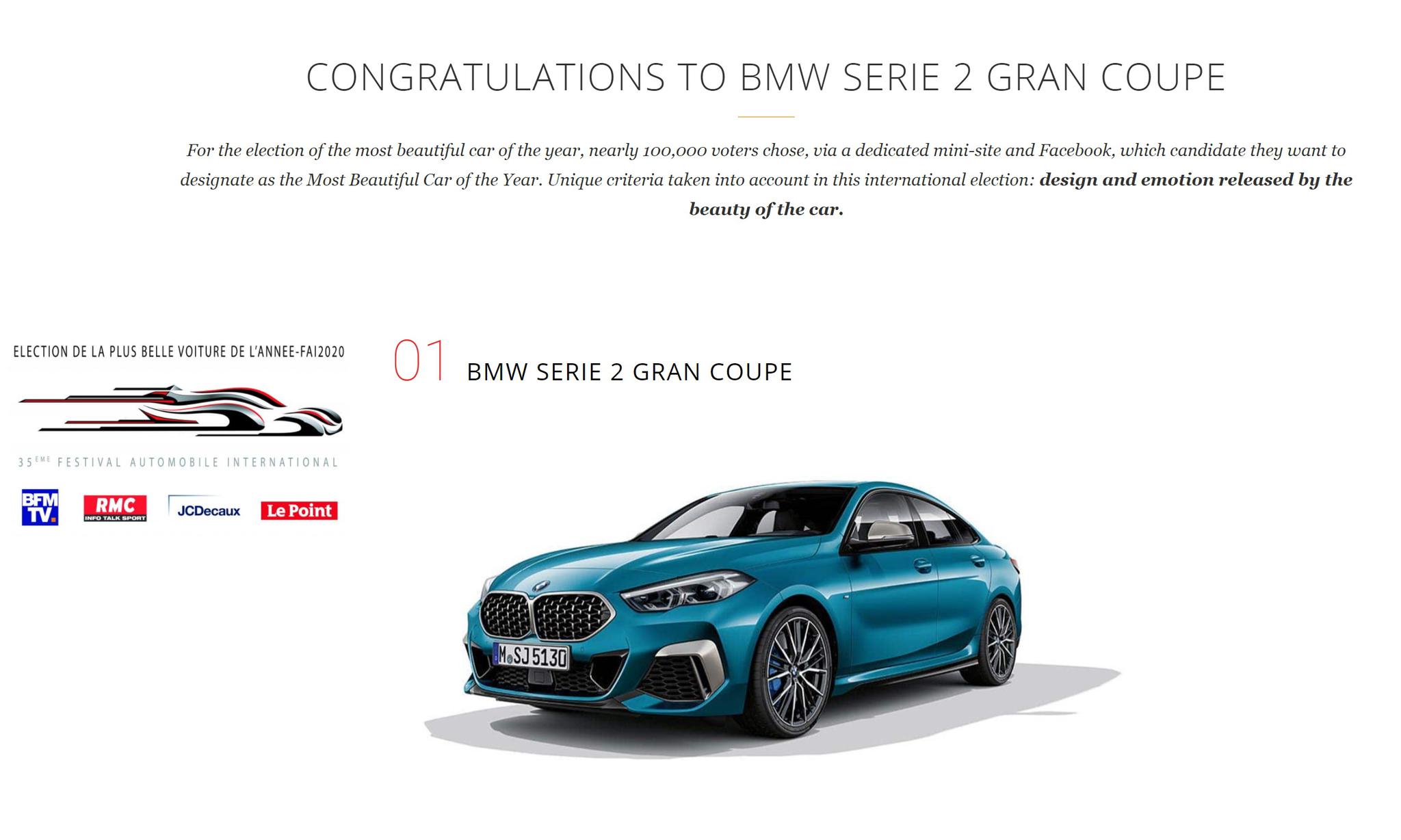 比较有意思的是,2020年1月29日在巴黎举行的第35届概念车和汽车设计展览会上,创新BMW 2系四门轿跑车经过评委投票,一举击败梅赛德斯-奔驰CLA、路虎卫士、福特Puma、标致208以及马自达3,拿下了“年度最美汽车”(Most Beautiful Car of the Year)大奖。