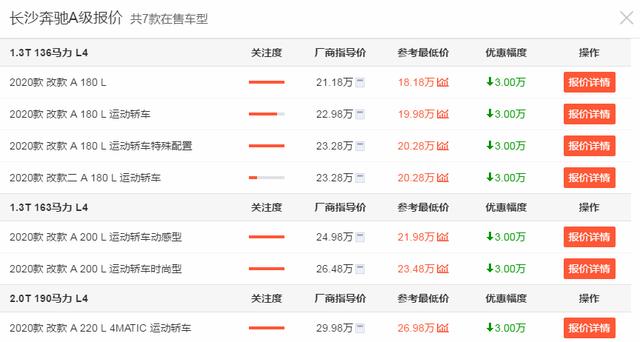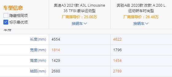 此次对比,小编选取了奥迪A3 2021款 A3L Limous ine 35TFSI豪华运动型(下文将简称为2021款奥迪A3L),指导售价(25万元),目前暂无优惠信息。奔驰A级 2020款 改款A 200 L运动轿车时尚型,指导售价(26.48万元),优惠幅度:3万元。这两款车型的最终落地价,相差不大,所以具有很高的可比性,希望本次对比,能够给你在买车时提供一个参考建议。