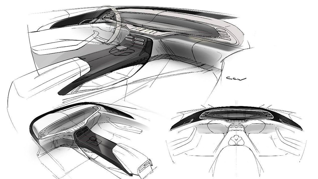 从设计草图上看,这套内饰依旧是采用环抱座舱的设计理念,并且中控台采用全新的设计语言,拓宽了视觉宽度,而且并没有看到旋转式中控屏的身影。在换挡杆区域,采用上下两层的设计,下层被掏空后,增加了储物空间。
