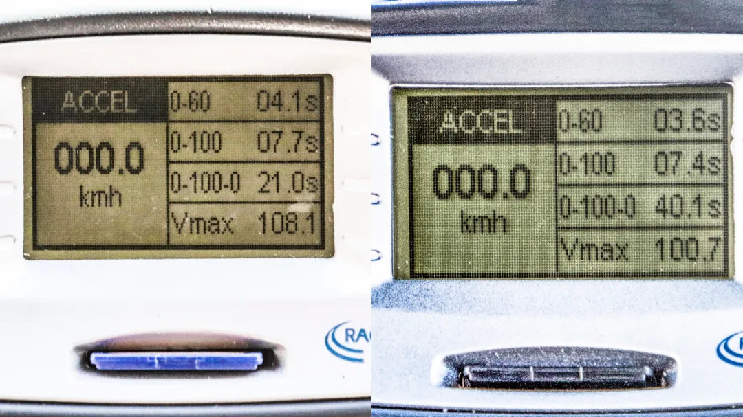通过观察上图两车在各个时速区间的加速成绩,我们就能发现为什么星瑞的0-100km/h加速成绩会比思域快上0.3秒了。在0-60km/h阶段,星瑞的3.6秒成绩直接比思域的4.1秒快出了0.5秒,而0-60km/h的加速,也正是对引擎初段动力释放要求最高的区间。得益于星瑞双离合变速箱可以在起步瞬间输出更大扭矩,甚至大到可以让车辆轮胎出现剧烈打滑,所以星瑞在从静止到动起来的过程中便建立了巨大优势。
