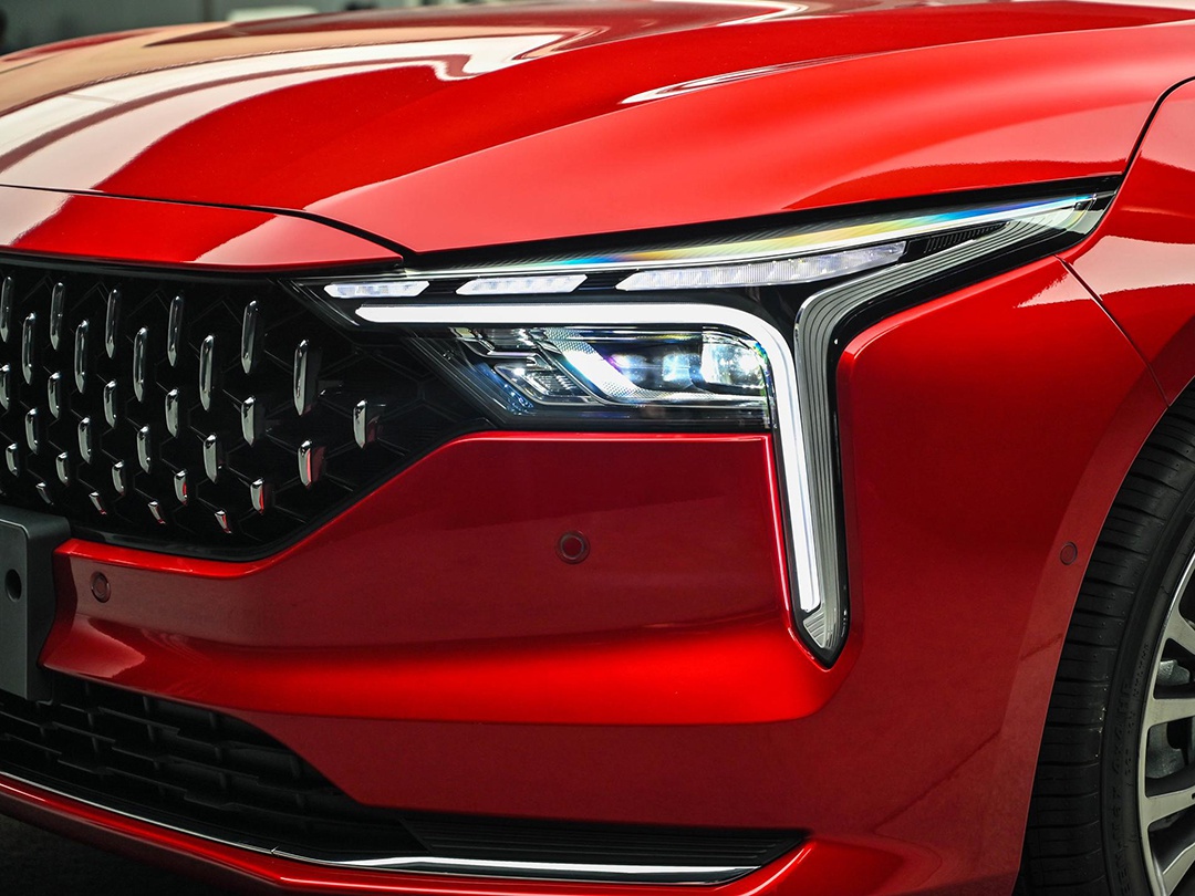 前大灯的设计灵感源于古代兵器“戈”,其尺寸较大,内部采用全LED光源,加上“7”字形的灯带,点亮后有着较高的辨识度。并且内部还采用分层式设计,被灯带分隔为上下两层。