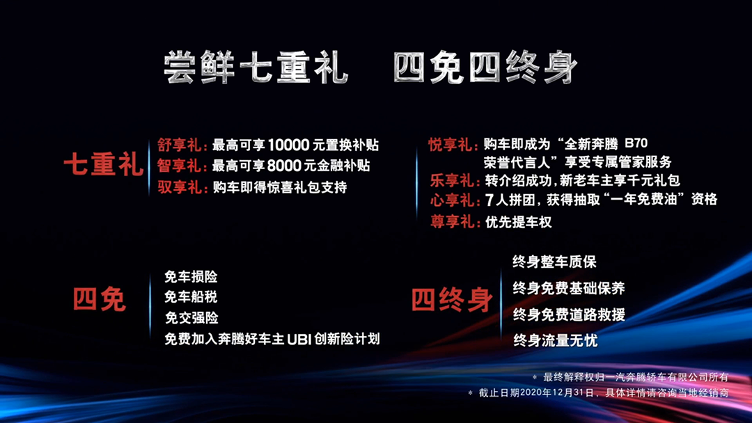 与此同时,官方还为购车的消费者提供七重礼遇以及四免四终身的承诺。包括最高可享1万元置换补贴的舒享礼,最高可享8000元金融补贴的智享礼,购车即得惊喜礼包的驭6享礼,以及优先提车权的尊享礼等七重购车礼遇;另外,还有免车损险、免车船税、免交强险、免费加入奔腾好车主UBI创新险计划的四免,以及终身整车质保、终身免费基础保养、终身免费道路救援以及终身流量无忧的四终身。