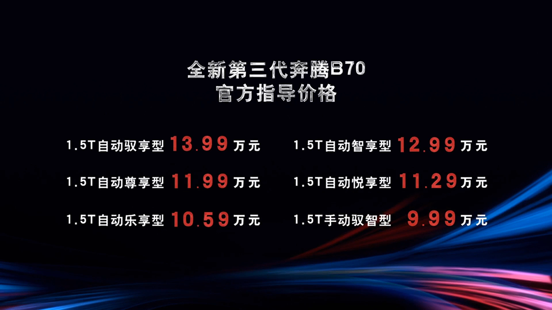 11月28日晚,全新第三代奔腾B70 (配置|询价)正式上市,新车推出6款车型,官方指导售价区间为9.99万-13.99万元。