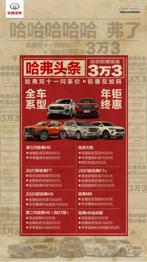11月25日,哈弗接棒长城汽车双十一超级直播夜活动,举办了一场“双十一同享价 哈弗钜惠再加码”年终促销活动线上沟通会,力保双十一优惠超长待机,和最高优惠3.3万元一样值得关注的是促销主题全称竟是——“哈哈哈哈哈,弗了”。