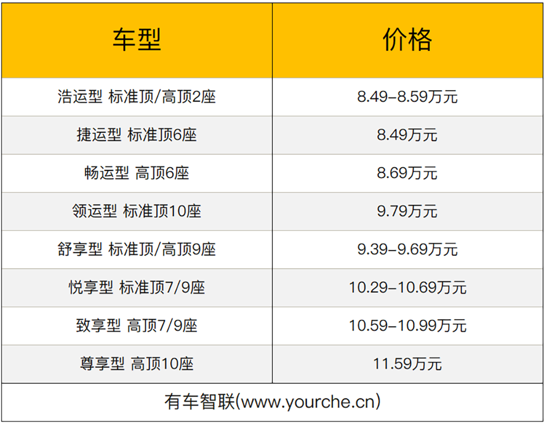 在车身尺寸上,标准顶车型的长宽高分别为5255/1825/1980mm,轴距为3430mm;而高顶车型的长宽高分别为5255/1825/2190mm,轴距为3430mm。标准顶车型采用双侧滑门设计,高顶车型则采用单侧滑门设计。