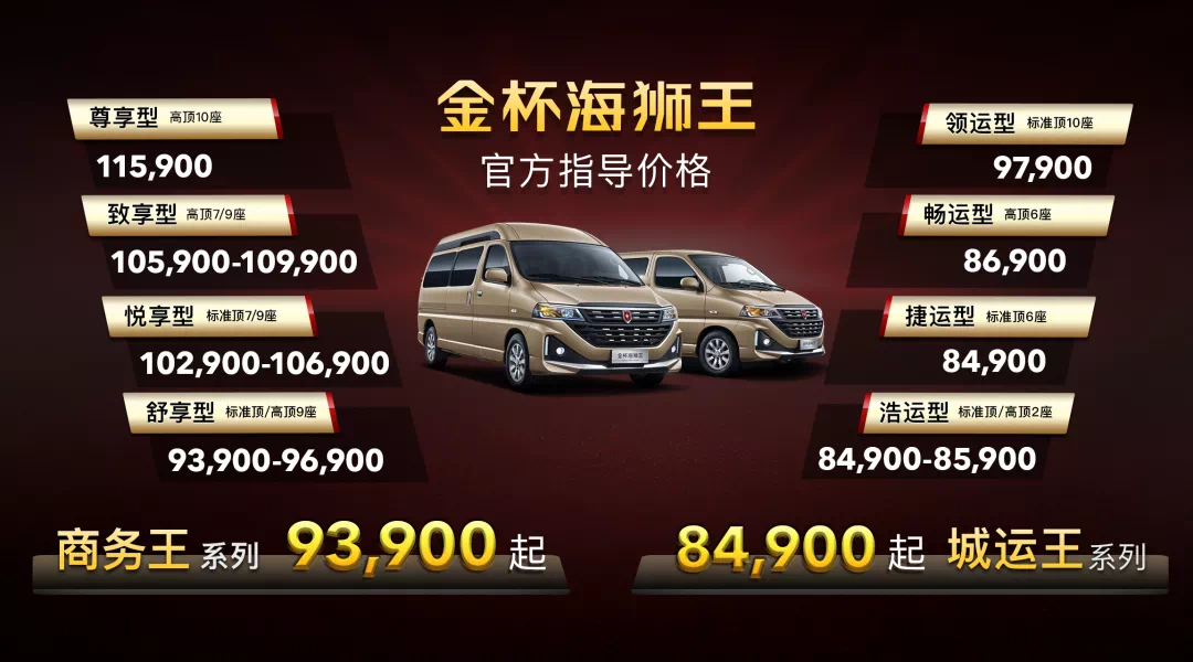 11月29日,华晨雷诺金杯合资后首款LCV——金杯海狮王 (配置|询价)在北京区域上市,官方指导售价区间为8.49万-11.59万元。其中城运王系列指导售价为8.49万-9.79万元,商务王系列指导售价为9.39万-11.59万元。