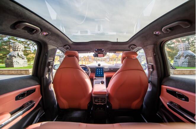 另外,蔚来EC6创新采用一体化穹顶式玻璃车顶,与溜背式后窗浑然一体。并采用双层高强度钢化玻璃,总面积达2.1㎡。由此车内也获得了一块超大采光尺寸的全景天幕式天窗,在私享最美天空的同时,还能隔绝超过83%的热量,以及99.9%的紫外线。
