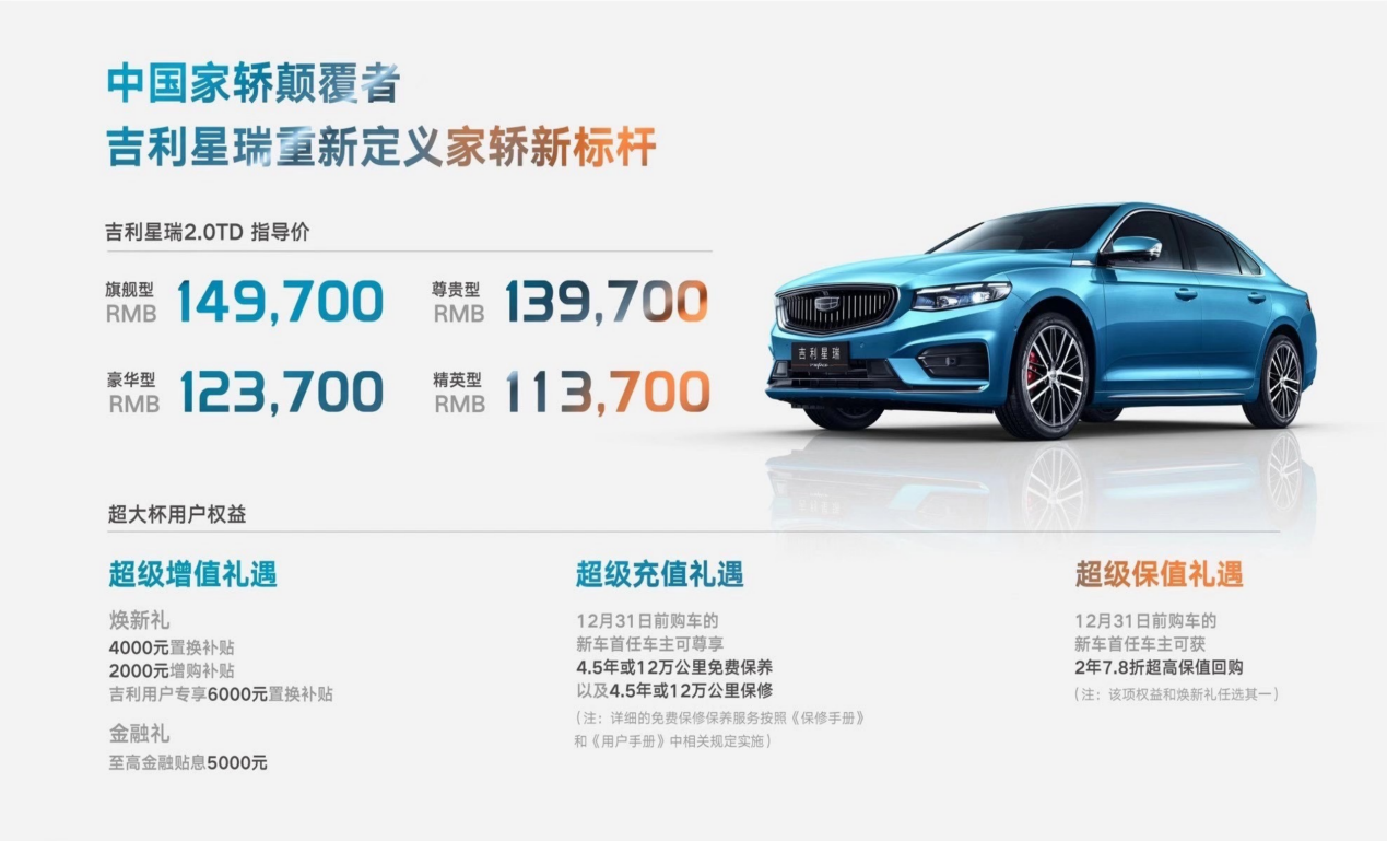 吉利CMA超级母体首款宽体A级轿车——是吉利星瑞的一款新品, 新车全系标配2.0TD+7DCT黄金动力系统,共推出4款车型,官方指导价为11.37万元—14.97万元。 该车此前进行了“不试,不比,不卖”的颠覆者行动,以“四大颠覆实力”刷新了用户对家轿的传统认知。