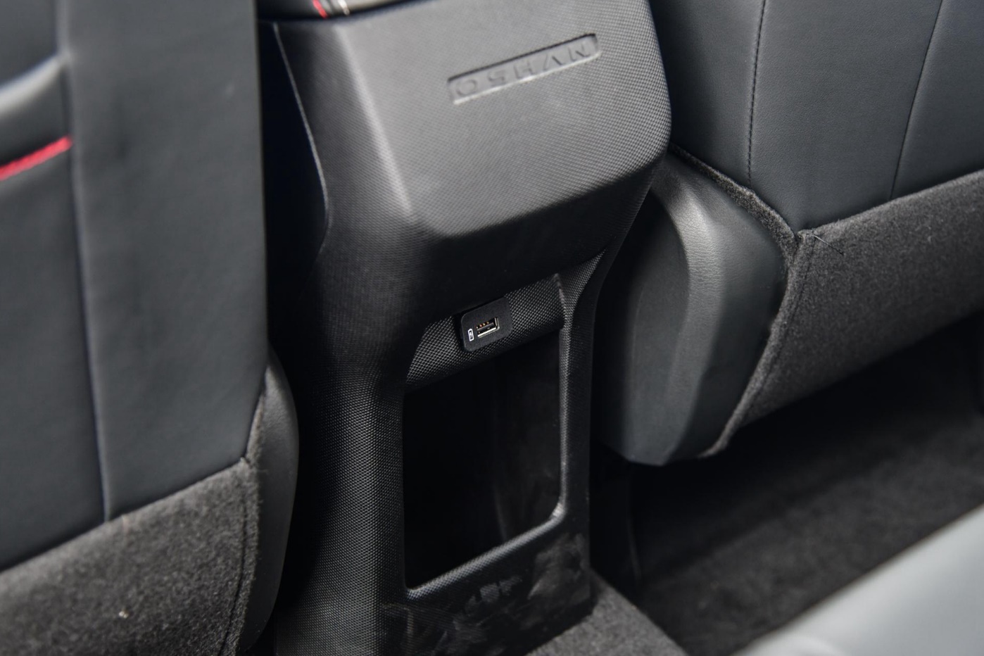 后排座椅材质和前排保持一致,乘坐软硬适中,另外,后排地板中央隆起幅度不大,不过因为中间部分的座椅偏硬并没有配备头枕,因此咖哥觉得长时间乘坐舒适性肯定没有两侧好。且全系车型后排都不带独立出风口,好在配备有一个USB-A充电接口。