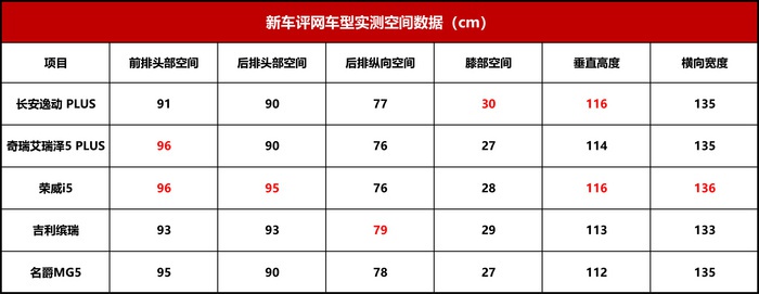 真是不比不知道,比比吓一跳。作为同级别高度竞争的对手,这几款国产轿车之间的车内空间差距竟然这么明显。总的来说,乘坐空间最好的是荣威i5,尾厢搬运很方便,不足的是其座椅填充有些过硬;长安逸动 PLUS座椅最软、最舒适,同时尾厢容积还很大,就是头部空间紧张;奇瑞艾瑞泽5 PLUS车内空间表现均衡,后排靠背坐垫设计有些割裂,尾厢容积比较小;吉利缤瑞后排空间较大,符合国内用车习惯,缺点尾厢不好用;名爵MG5除了后排因为溜背造型而导致垂直空间受限,其余各方面表现较为均衡。