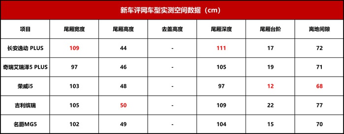 尾厢空间数据如上表,对于尾厢的理解我们可从三个维度出发,即长宽高的最大容积性能、尾厢台阶和离地间隙代表的便利性,以及开口大小的实用性。在最大容积性能方面,表现最好的是长安逸动 PLUS,在关键的宽度和深度数据上都非常亮眼,反之不太好的是奇瑞艾瑞泽5 PLUS和荣威i5,数据差距比较明显,其余的车型则是处于差不多的水平,各有优劣。