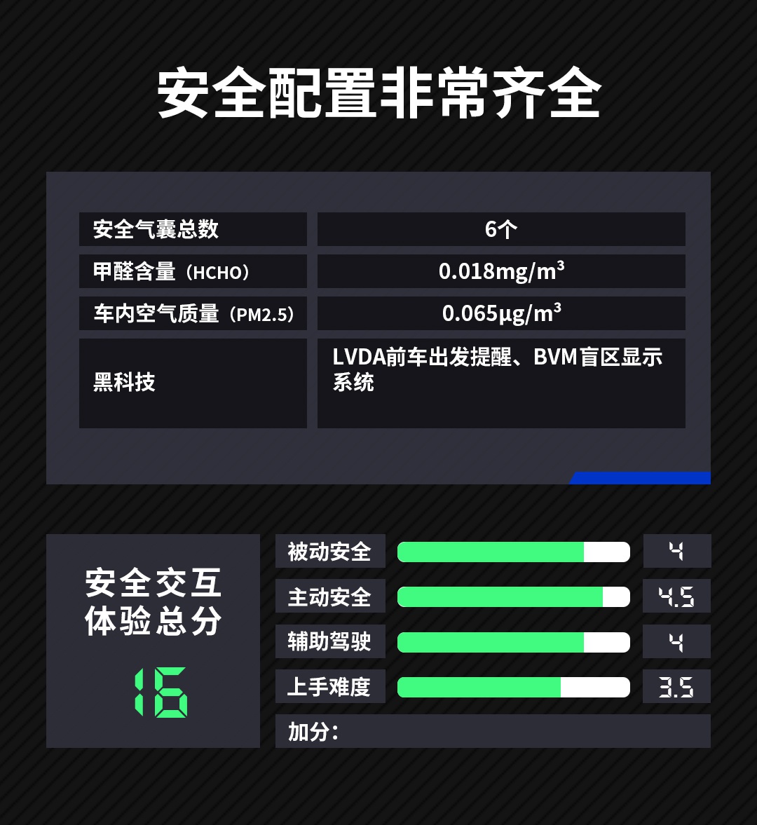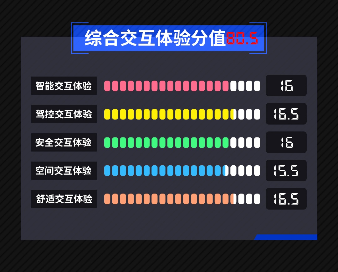 注:水滴汽车实测体系(DH-110)满分为100分,根据5大不同交互体验维度,每个维度预留出2分加分项。交互体验官可根据"同级唯一"或"率先搭载"等产品表现,酌情加分。