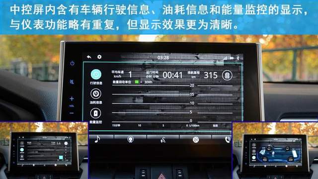 中控配备了一个10.1吋的悬浮式液晶触摸屏幕,点触的准确性不错,但反应不算很快,在行车过程中,驾驶员将被禁止调试蓝牙等功能,以保证行车安全。除了一般的蓝牙和导航功能外,新车还支持连接百度CarLife和语音控制功能。驾驶员还可以通过中控屏查看车辆的能量监控图,油耗信息和行驶信息。