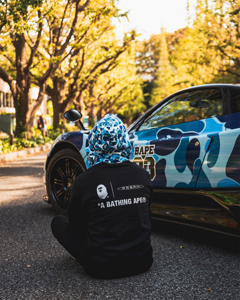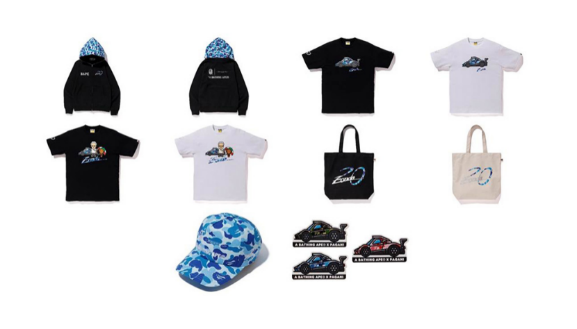 此外BAPE方面,还为此次合作众多配件如经典款式帽衫,胸前与背后印有BAPE与Zonda 20周年和Pagani的字样LOGO。