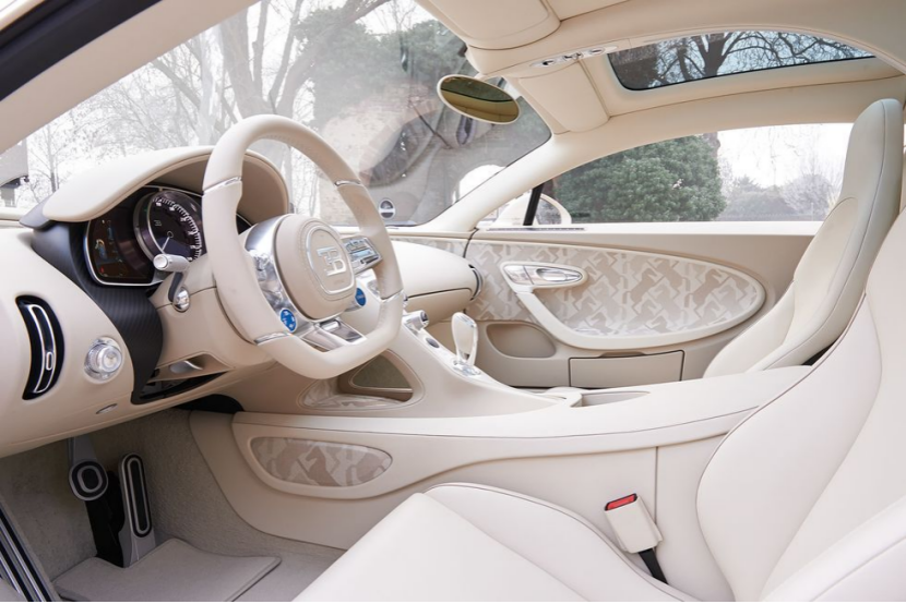 该车耗时3年打造,全车采用了爱马仕定制的奶油白色车漆,同时轮圈也与外观配色保持一致。此外,前格栅、前唇、后尾翼等处采用了爱马仕独特花纹。