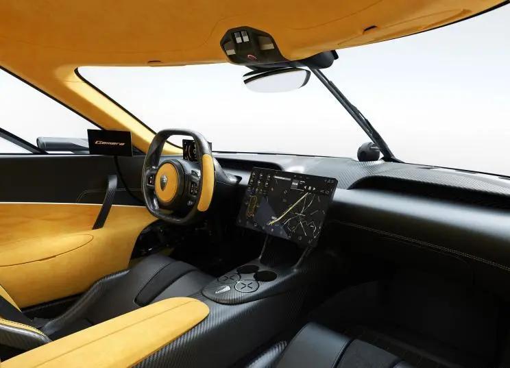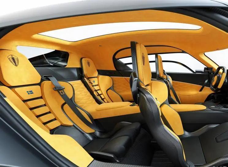 打开车门可以发现,Gemera竟然是一台四座车型,这也是柯尼塞格旗下首款四座跑车。车厢主要由五块屏幕组成,车门板上的两块用于显示后视镜内饰,这就意味着它的外后视镜被摄像头取代,此外还有全液晶仪表、中控娱乐屏幕以及后排娱乐屏幕,显得既简约又有科技感。