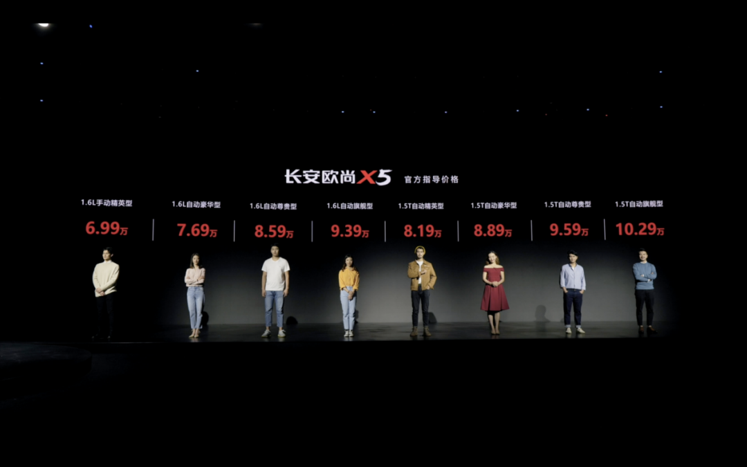 创造了12天订单破万、上市前订单破20000的纪录,长安欧尚X5未上市先火,在已经“杀”成一片红海的中国SUV市场堪称现象级新车。11月29日,长安欧尚全新战略产品——长安欧尚X5终于迎来上市,新车售价区间为6.99万-10.29万,共推1.6L+5MT/CVT和1.5T+7DCT三种动力组合共8款车型。(相比预售价6.99-10.59万元,顶配车型价格略低了3000元)