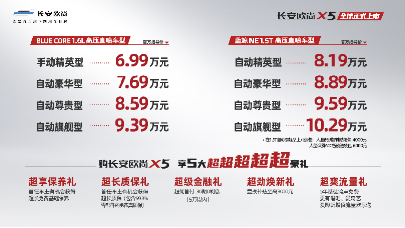 伴随着前期的不断预热,长安欧尚X5于近日正式上市,新车官方指导价6.99万-10.29万元。两套动力:一个是蓝鲸NE 1.5T涡轮增压发动机、另一套是1.6L自然吸气发动机。根据款型配置不同,分为8款车型。同时,全国400家长安欧尚全新云鹰标4S店也进行了开业庆典。