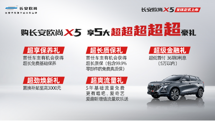 除了以上提到的配置外,官方还推出了选装。在1.5T自动旗舰型上花4000元可选装人脸识别智能选装包、花6000元可选装人脸识别ACC智能选装包。上市当天,长安欧尚X5还推出了超享保养礼、超长质保礼、超级金融礼、超劲焕新礼、超爽流量礼五大购车福利。