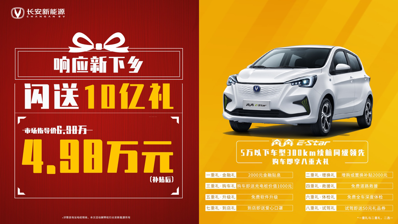 11月25日,国务院常务会议提出要稳定和扩大汽车消费,开展新一轮汽车下乡。长安新能源率先极响应国家号召,旗下奔奔E-Star (配置|询价)优惠补贴后仅4.98万元起,成为这个价位新能源汽车的品质之选。