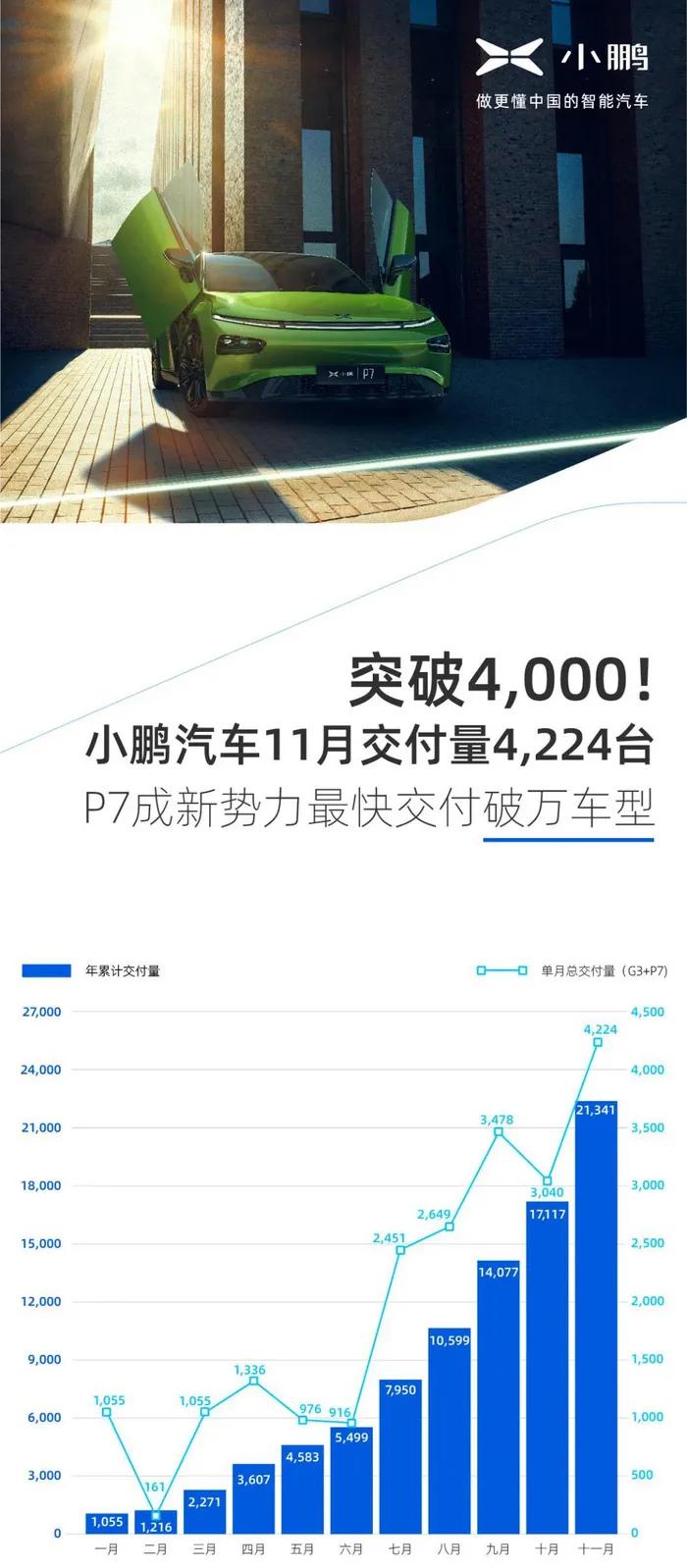 近日,小鹏汽车公布了今年11月份的交付成绩。其中,单月总交付量达到4224台,同比大涨342%,创今年新高。而2020年1-11月累计交付21,341台,同比增长87%;小鹏P7 (配置|询价)单月交付量2,732台,环比增长30%,刷新单月交付数记录;自今年6月底启动规模交付以来,已累计交付11,371台;小鹏G3单月交付1,492台,环比增长59%,创2020年新高。这样的成绩,足够小鹏过个肥年了。