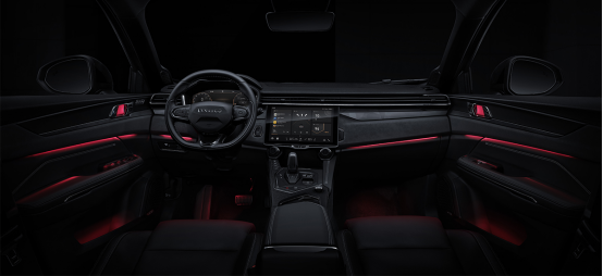 内饰方面以年轻运动为主,整体色调采用酷黑质感。设计语言采用领克2.0代内饰设计语言, 主打科技和豪华。当然12.3和12.7两个智能大屏幕主要负责科技,皮质一流的多功能方向盘和精巧灵敏的电子挡把以及众多的翻毛包裹则负责了豪华的部分。贯穿式的中控出风口设计巧妙的提升了车内视觉宽度,多达1600万色的连续可调无极氛围灯终于可以自豪地说:满足所有人的氛围颜色喜好。同时领克2.0代智能车机搭载高通骁龙820A+恩智浦i.MX6Q芯片,双4核车机你怕了吗?