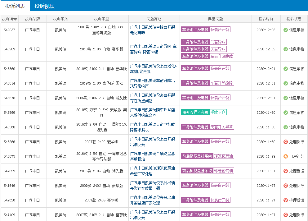广汽丰田凯美瑞,销量虽然一直非常稳定,但是出现的问题似乎也不少,尤其是最近的投诉,我们可以发现典型问题就是仪表台开裂,主要集中在老款车型上面。