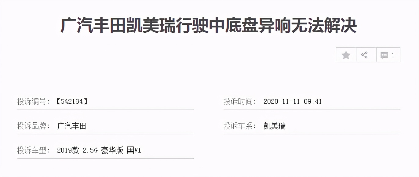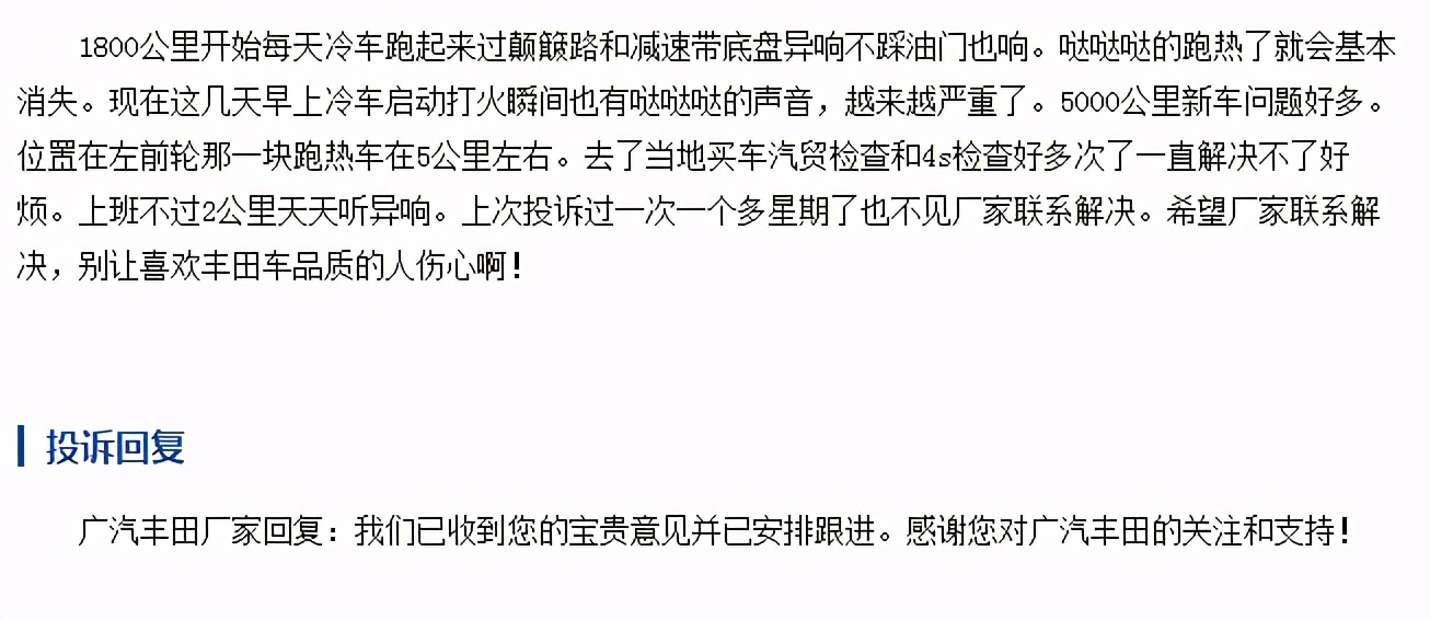 你们也不要觉得2019款的丰田凯美瑞就没“毛病”,这位2019款丰田凯美瑞的车主投诉凯美瑞底盘异响,并且还去4S店检查过,但并没有解决问题。从车主反馈的问题来看,广汽丰田不止要把控品质,更要提升售后服务。