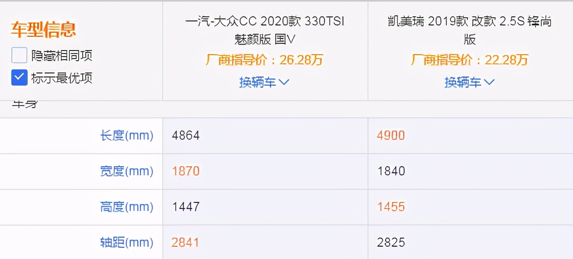 车身尺寸方面:大众CC和丰田凯美瑞不相上下