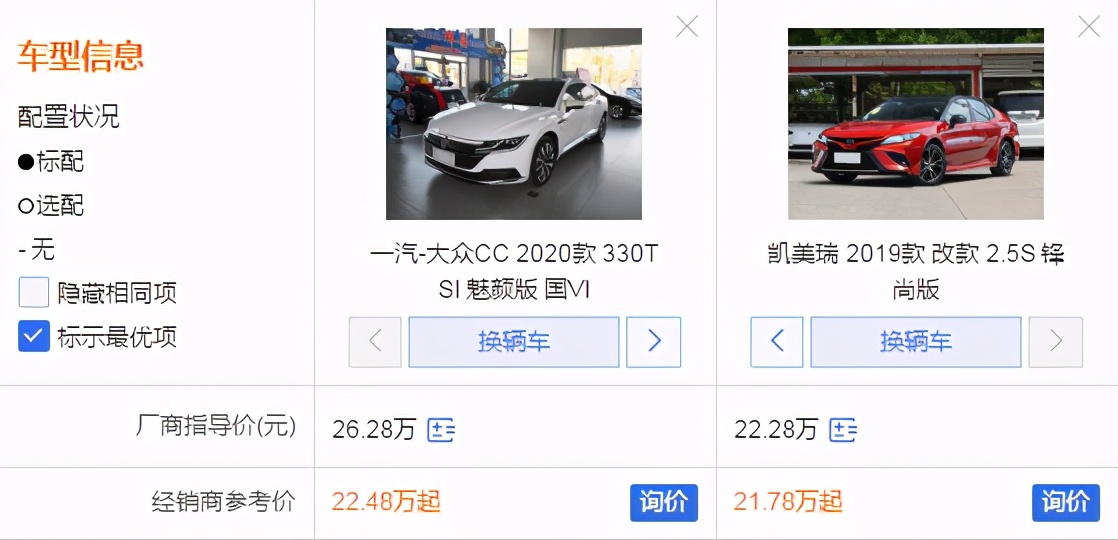此次对比,小编选取了2020款一汽大众CC 330TSI 魅颜版,指导售价:26.28万元,优惠幅度:3.8万元。2019款 丰田凯美瑞 改款2.5S 锋尚版,指导售价:22.28万元,优惠幅度:0.5万元。参考全国的终端优惠,这两款车型的最终落地价相差不大。希望本次的对比能够让你买车的时候提供一个参考。