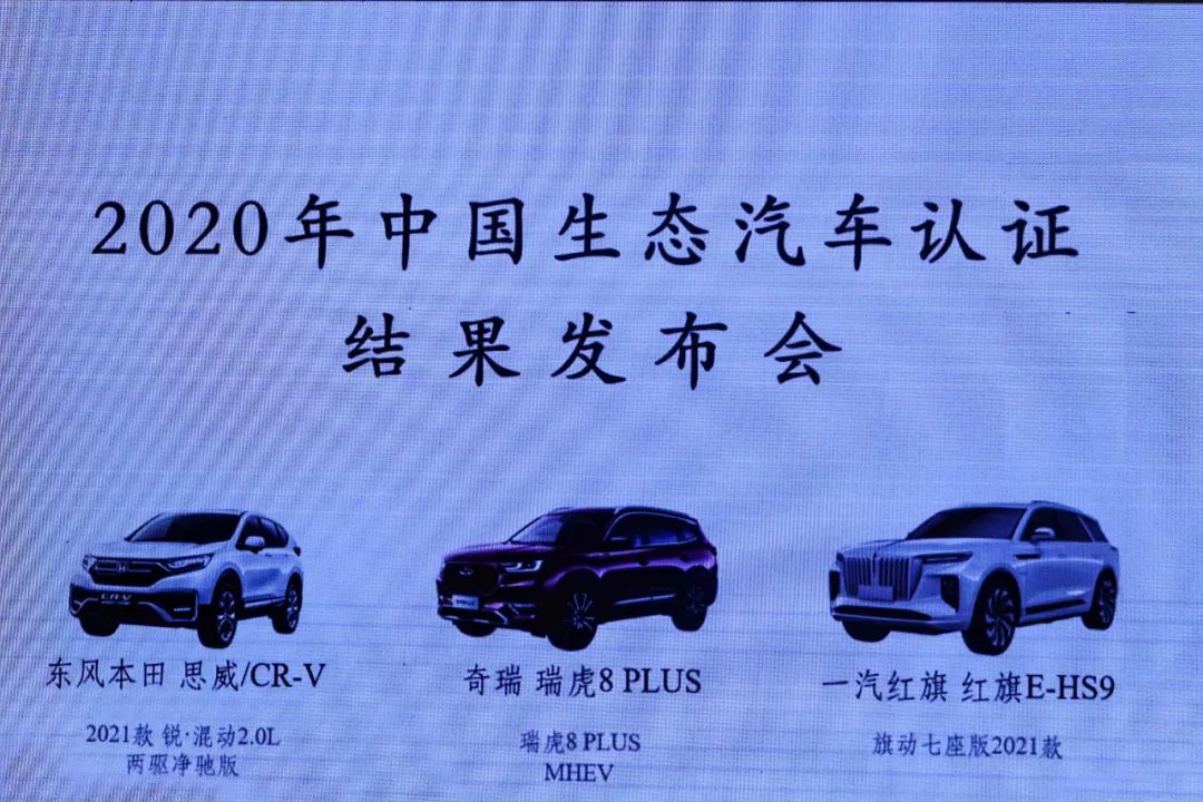 在活动现场,共有三款车型成为了2020年度的生态汽车白金牌车型,分别为东风本田思威/CR-V 2021款锐·混动2.0L 两驱净驰版、奇瑞瑞虎8 PLUS MHEV和红旗 E-HS9旗动七座版2021款。随后,来自东风本田、奇瑞汽车、一汽集团的车企代表依次上台,领取了这份汽车行业生态设计的最高荣誉。